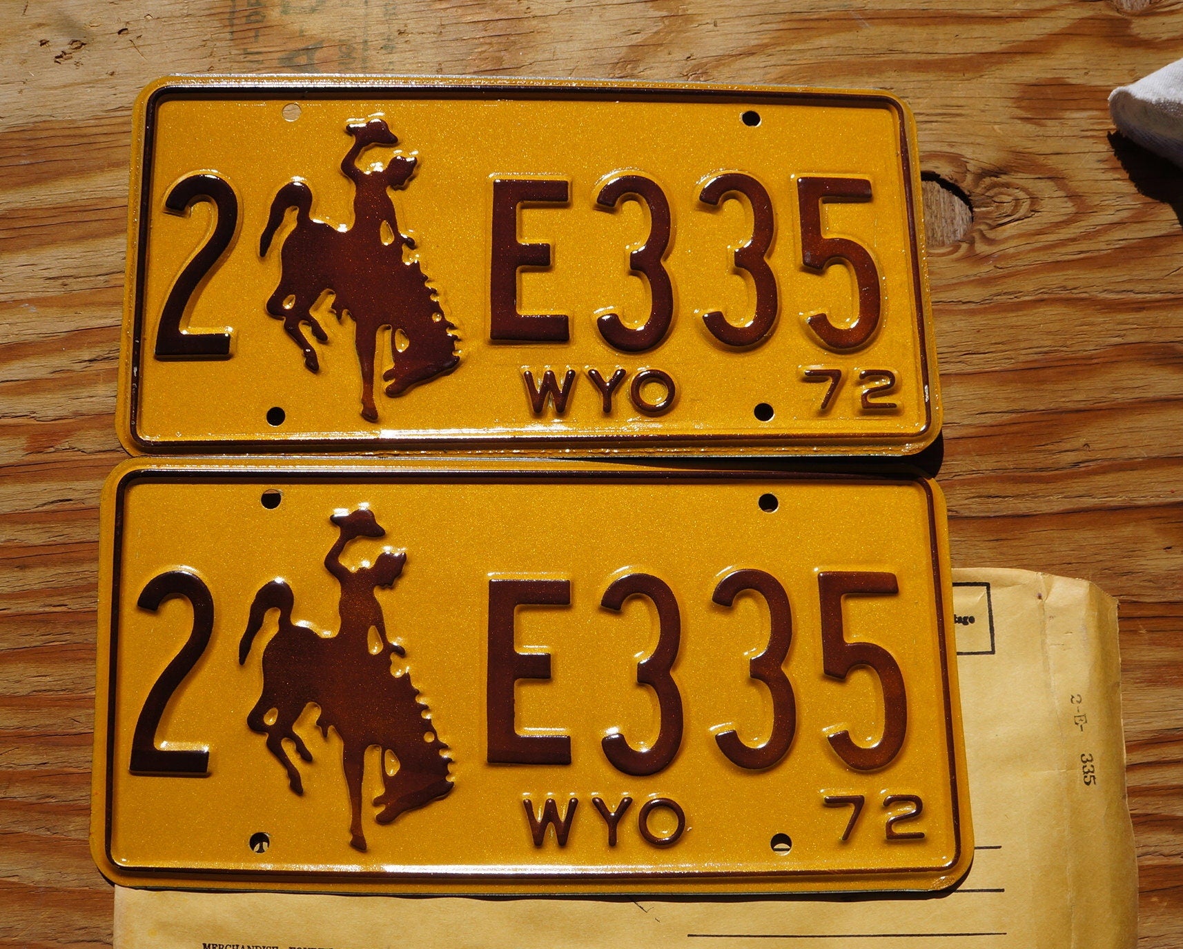 1972 Wyoming Cowboy Horse License Plate Pair - Brown & Yellow