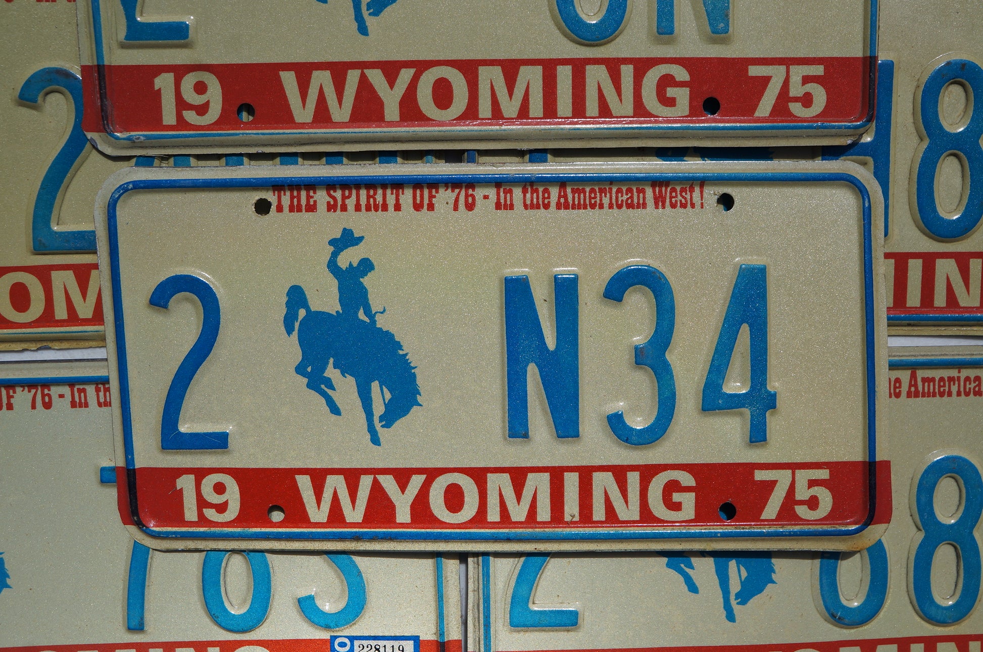 This listing is for One or More - 1975 1976 1977 WYOMING LICENSE PLATES - BICENTENNIAL COWBOY HORSE Graphic Embossed License Plate Tags with Random Numbers in GOOD Condition. They are sold individually and you can choose as many plates as desired.