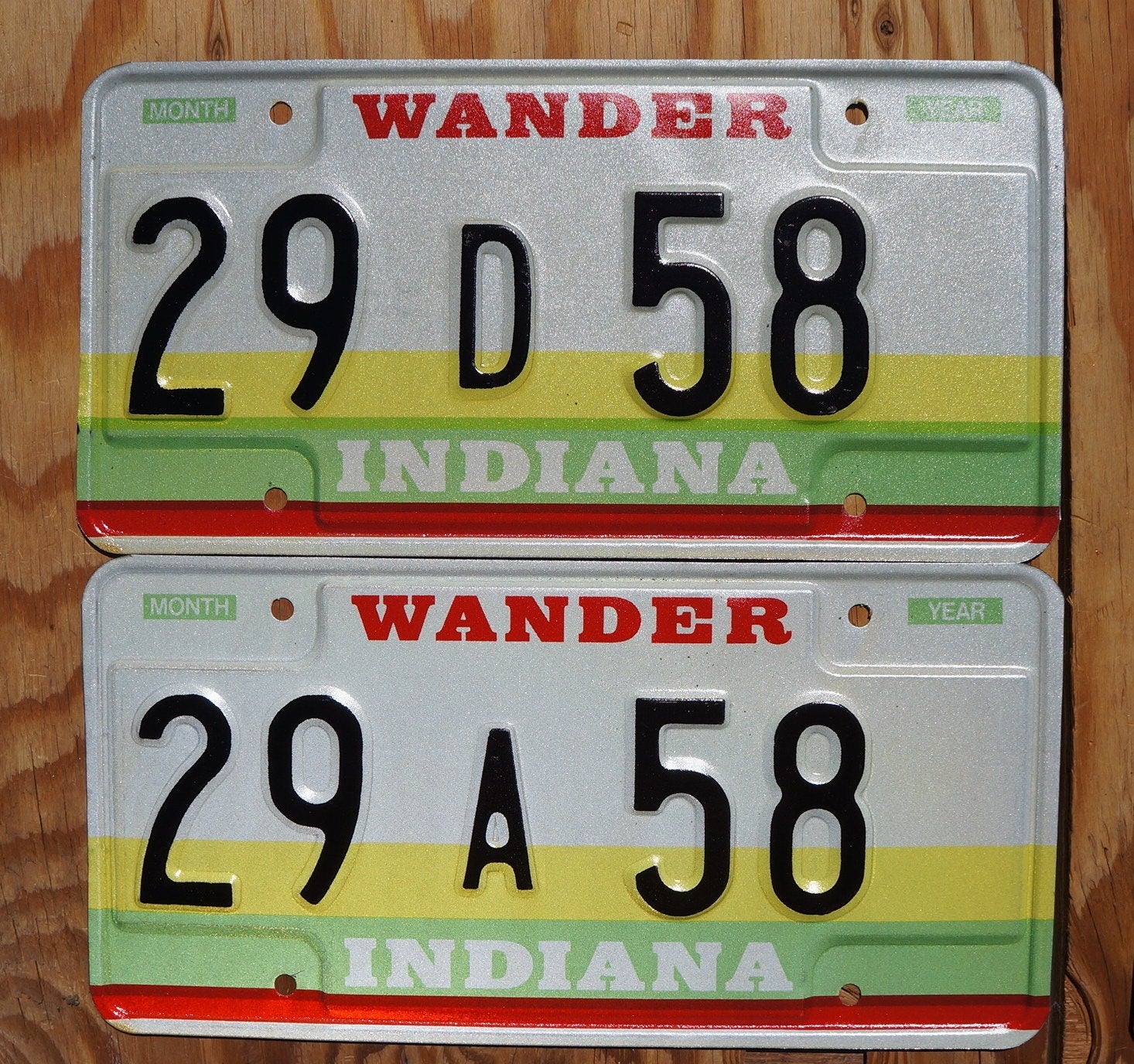 1980s Indiana Wander License Plate Pair: Yellow, Green, and Red Stripes