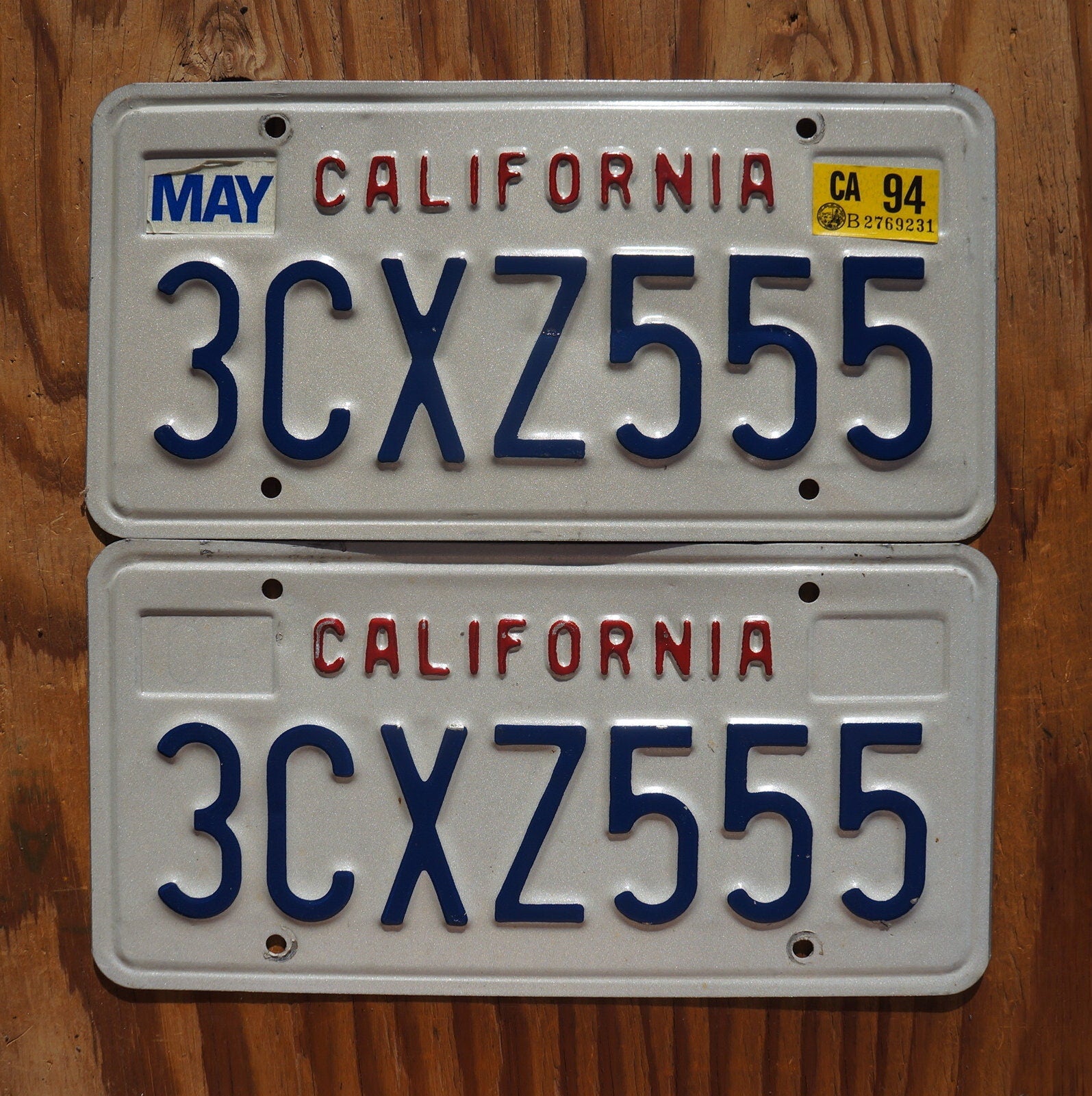 1994 California Vintage License Plate PAIR / SET # 3CXZ555