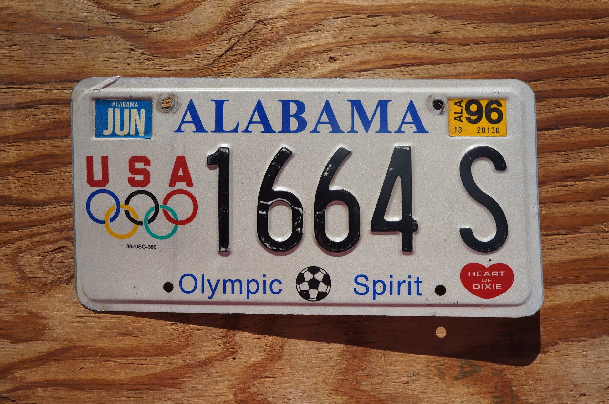1996 Alabama OLYMPIC SPIRIT License Plate - 5 Rings USA Soccer Game