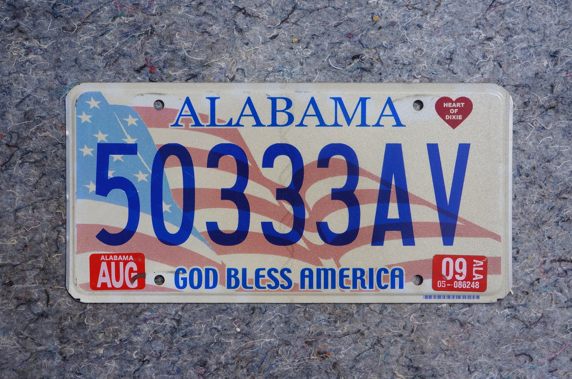 This listing is for one 2009 Alabama GOD BLESS AMERICA License Plate # 50333AV.